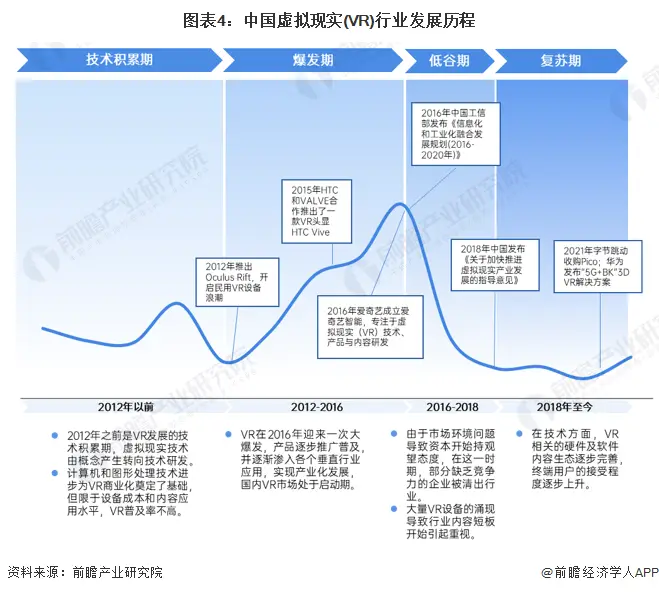 观察我国虚拟现实的发展历程,我们看到了技术积累的过程,还有2012年到2016年间的快速增长。在那几年里,VR技术不断进步,新型硬件产品不断推出,吸引了大量玩家和资本的注意。然而,从2016年到2018年,行业遭遇了低谷,受到宏观经济环境和内容制作难题的冲击,一些竞争力较弱的企业被淘汰。从2018年底开始,行业开始慢慢回暖,我国发布了首个关于“虚拟现实”的政策,还在“十四五”规划中将VR/AR产业列为重点产业之一,并推出了一系列相关政策措施。