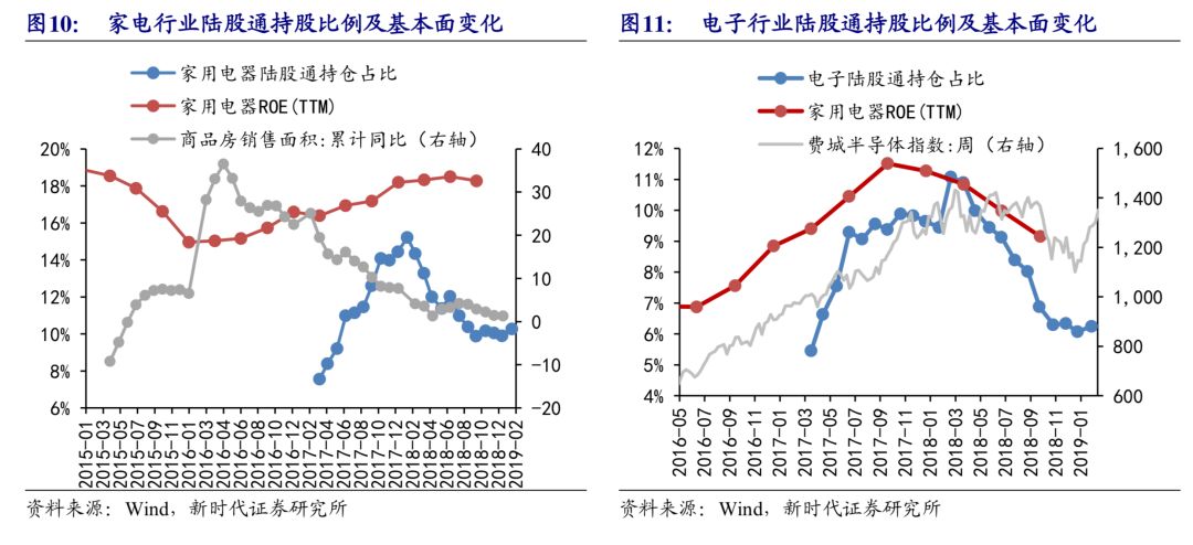 陆股通资金在2018年1月和2月,对家电和电子行业的持股比例分别达到了15%和11%的顶点,随后全年持续减少,降至10%和6%。这一变化清楚地表明,陆股通资金会根据行业的景气度调整其配置。由此可见,行业景气度对外资的行业配置有着显著的影响。